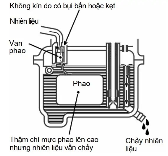 Phao thủng: Xăng lọt vào trong phao làm phao chìm → van kim luôn mở → tràn xăng liên tục.